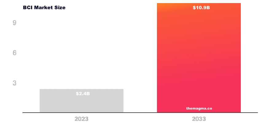 Pour preuve : en 2023, le marché mondial des BCI était évalué à $2,35 Mds et devrait atteindre plus de $10,89 Mds d’ici 2033. Cette dynamique est alimentée par des avancées technologiques majeures, et un élargissement des cas d’usage.